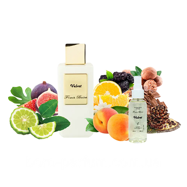 Το Velvet του Franck Boclet είναι ένα άρωμα για γυναίκες και άνδρες. Το Velvet κυκλοφόρησε το 2019.Οι νότες κορυφής είναι περγαμόντο και πορτοκάλι, οι μεσαίες νότες είναι δαμάσκηνο, ροδάκινο και νερολί, οι νότες βάσης είναι μαλλί της γριάς, σανταλόξυλο, κέδρος και μόσχος.